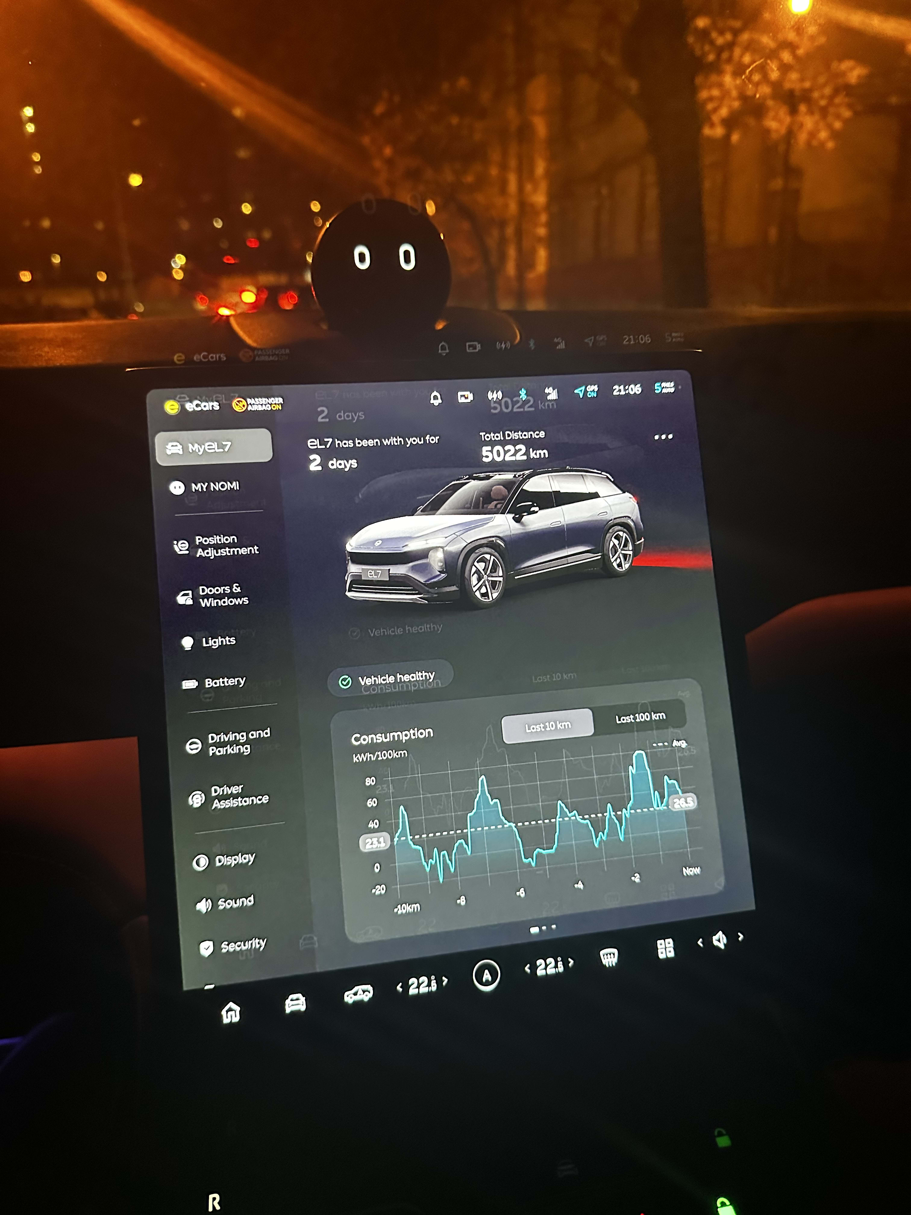NIO EL7 je elektrické luxusné SUV je vybavené rôznymi high-tech prvkami, ktoré zaisťujú pohodlie a vysokú kvalitu. Centrálny 12,8-palcový AMOLED displej poskytuje vysoké rozlíšenie obrazu. NOMI vo vrchnej časti palubnej dosky ponúka všetky funkcie systému hlasovej asistencie špecifické pre NIO. NIO EL7 je vybavené audio systémom s 23 reproduktormi a výkonom 1 000 W.